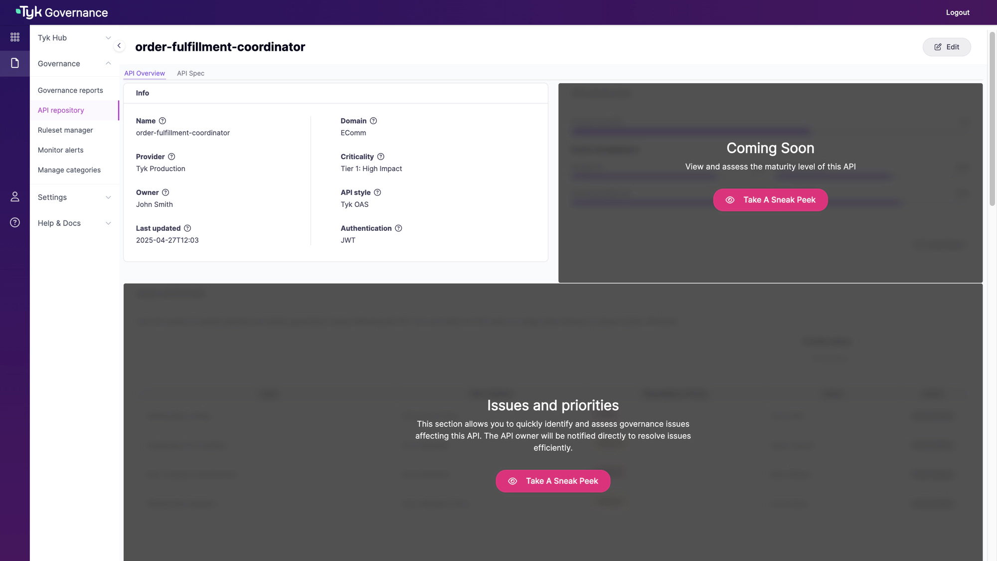 API Repository automatically discovers and catalogs APIs across multiple sources (Tyk, AWS API Gateway, etc) to create a comprehensive inventory of all APIs in your organization. This feature addresses API sprawl, identifies shadow APIs, and provides complete visibility into your API landscape.